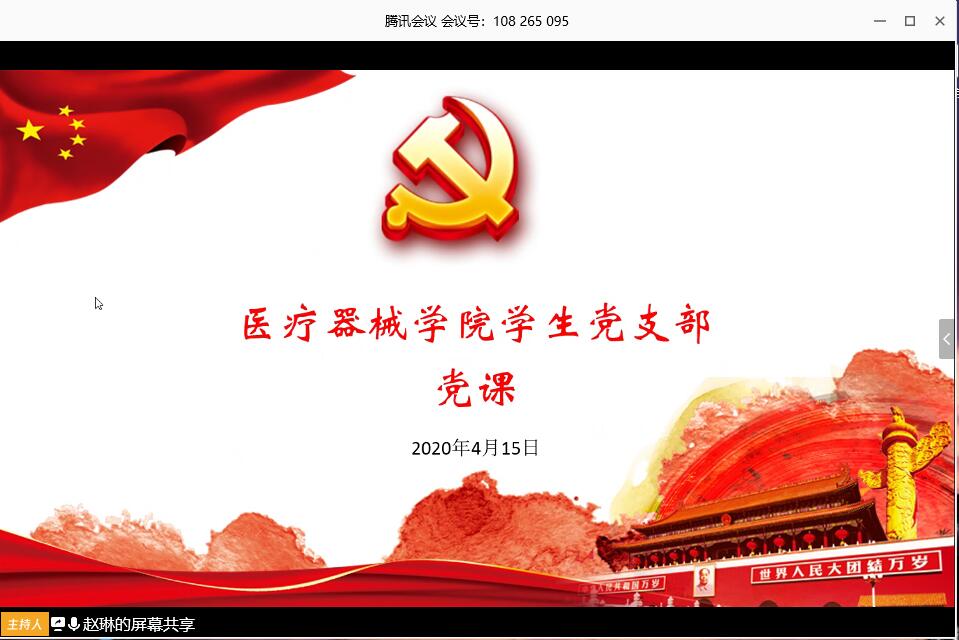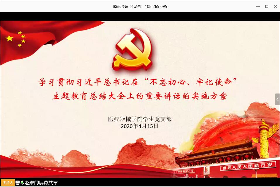 4月15日,学生党支部召开了线上党员大会。全体党员认真学习了2020年1月8日习近平总书记在“不忘初心、牢记使命”主题教育总结大会上的讲话,対校党委印发的《学习贯彻习近平总书记在“不忘初心、牢记使命”主题教育总结大会上的重要讲话的实施方案》文件进行了解读,并将其作为今年支部重点学习内容,要求全体党员不断深化认识、提升意识、凝聚共识,对标“六大成果”认真进行自我检视反思,研学“六条经验”深化主题教育理论成果,同时加强党的理论知识及党章党史的学习,加强自我检视力度,及时发现问题,认真整改问题,努力提高政治素养。