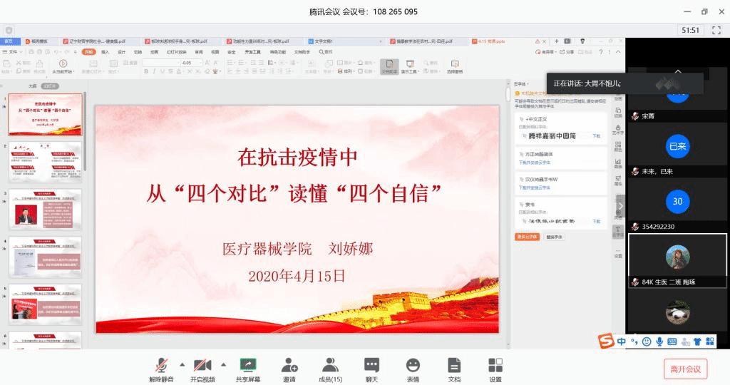 支部书记刘娇娜为全体党员讲授《在抗击新型冠状病毒肺炎疫情中从“四个对比”读懂“四个自信”》专题党课。从疫情期间党团结带领人民群众共同抗“疫”,共克时艰的多项举措,深入学习了“只有中国特色社会主义才能发展中国”的道路自信、“新时代呼唤新思想,新思想引领新时代”的理论自信、“鞋子合不合脚,只有自己穿了才知道”的制度自信、“只有坚守中华文化立场,不忘本来、面向未来、吸收外来,才能屹立于世界志林”的文化自信等内容,强化党员的责任担当,厚植家国情怀。
