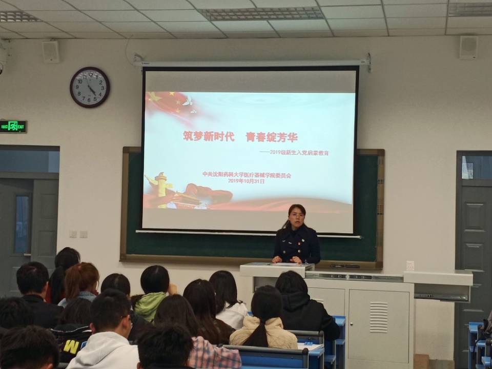 2019年10月31日,bat365中文官方网站党委副书记赵宏格以“筑梦新时代,青春绽芳华”为题为全体新生做入党启蒙教育。辅导员宋菁主持活动。