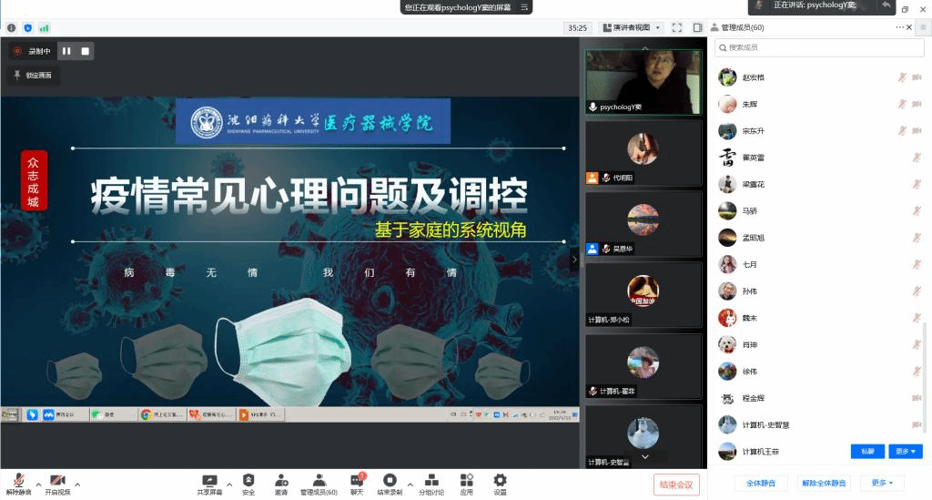 为进一步缓解疫情防控期间全院教职工居家办公的心理压力,做好疫情期间的心理调适,提高心理健康水平,bat365中文官方网站于4月13日,面向全院教职工开展线上心理健康讲座。本次讲座邀请到沈阳体育学院运动人体科学学院副教授,应用心理学博士窦广波,为全院教职工做题为《疫情常见心理问题及调控——基于家庭的系统视角》专题辅导讲座,学院全体教师参加了本次讲座。