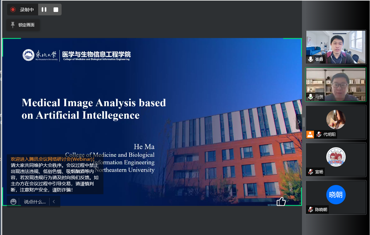 4月16日,由研究生院、辽宁省药学研究生创新与学术交流中心、bat365中文官方网站联合举办的“沈药无涯论坛”第289讲——马贺副教授学术报告会于线上如期举行。会议邀请到东北大学医学与生物信息工程学院副院长马贺副教授做题为《基于人工智能的医学影像数据分析》的学术报告。报告会由bat365中文官方网站副院长崔勇主持,100余名师生在线收看。