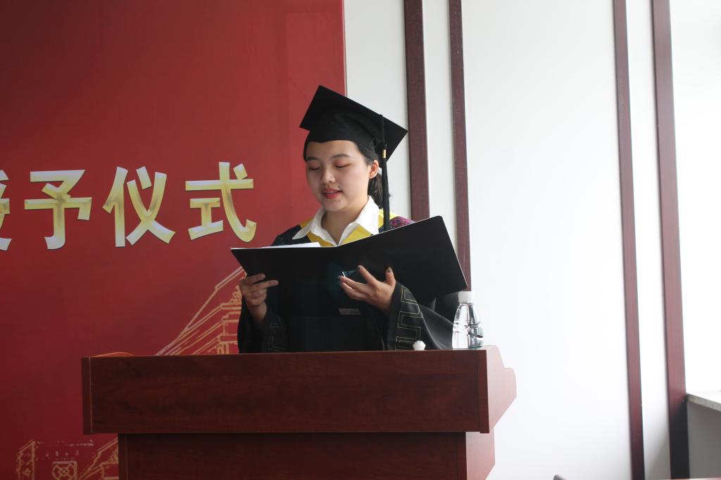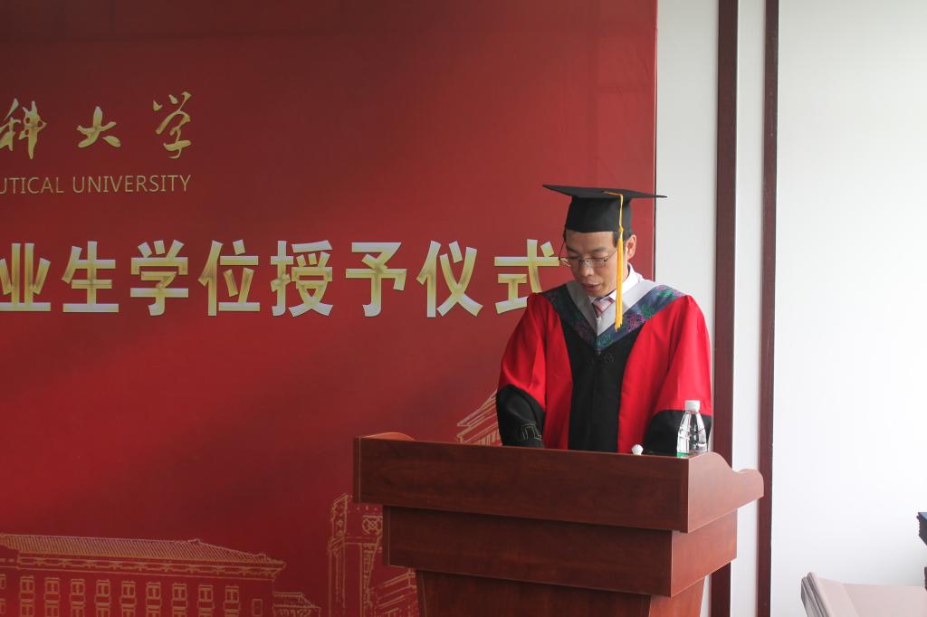 学位授予完成后,2021届研究生李雯雯代表全体毕业研究生发言。她向辛勤培育自己的母校、师长,向支持和关心自己的家人和朋友们表达诚挚的敬意和衷心的感谢,并庄严承诺要将个人所学奉献于社会,把推动祖国药学事业的发展作为自身责任和时代使命,勇做走在时代前列的奋进者、开拓者、奉献者,以执着的信念、优良的品德、丰富的知识、过硬的本领,担负起时代重任,在实现中国梦的伟大征程中大显身手,创造出自己的精彩人生。