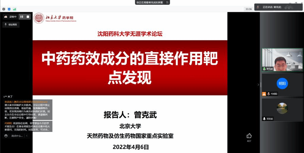 4月6日,由研究生院、辽宁省药学研究生创新与学术交流中心、bat365中文官方网站联合举办的“沈药无涯论坛”第278讲——曾克武学术报告会于线上如期举行。会议邀请到我校66K校友、北京大学曾克武研究员做题为《中药药效成分的作用靶点发现》的学术报告。报告会由bat365中文官方网站副院长项荣武主持,200余名师生在线收看。