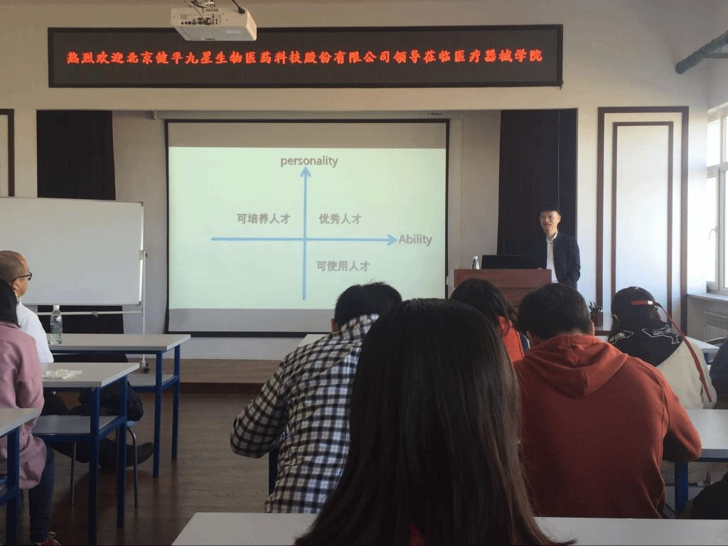 北京健平九星生物医药科技有限公司董事长邹检平从求学、创业、心灵、远方四个部分展开对自身创业经历的介绍和对公司的介绍,同与会同学积极交流。邹检平对当代大学生就业选择进行了深度的剖析,分别讲述了自身的求学经历、创业的新路历程,讲解了目前公司的主营业务、主要产品及公司发展前景,介绍了九星英才(之星座)计划及公司的招聘流程及招聘需求,欢迎同学们毕业后进入建平九星工作学习。