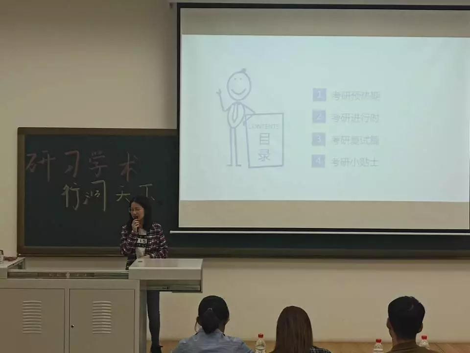 讲座开始,赵琳与黎萍学姐为同学们分享了考研经验,赵琳学姐从择校、初试、复试入手,推荐了多个对大家择校有帮助的公众号。黎萍学姐的“授课”风格颇为风趣,讲述了很多考研路上的小故事,坎坷之多凸显出学姐的毅力。随后张丽萍学姐将保研的条件逐一列出,之后为大家详细介绍了保研的基本流程及准备工作,并指出参加夏令营争取到“优秀营员”将会有丰厚的福利。最后是费云扬学长的留学经验分享。他说:准备出国留学的同学要有一个漂亮的简历,简历里要有你参加过的比赛奖项,在面试时要表决自己努力的决心,同时要体现出自己的实力。在研讨会接近尾声时,一位大二的同学向费云扬学长请教了问题:去日本留学对于日语要求会不会很高?学长表示自己的日语水平也不足以和日本大学生正常交流,但这并不影响他的出国进程。随后,研讨会也在热烈的掌声中拉下了帷幕。